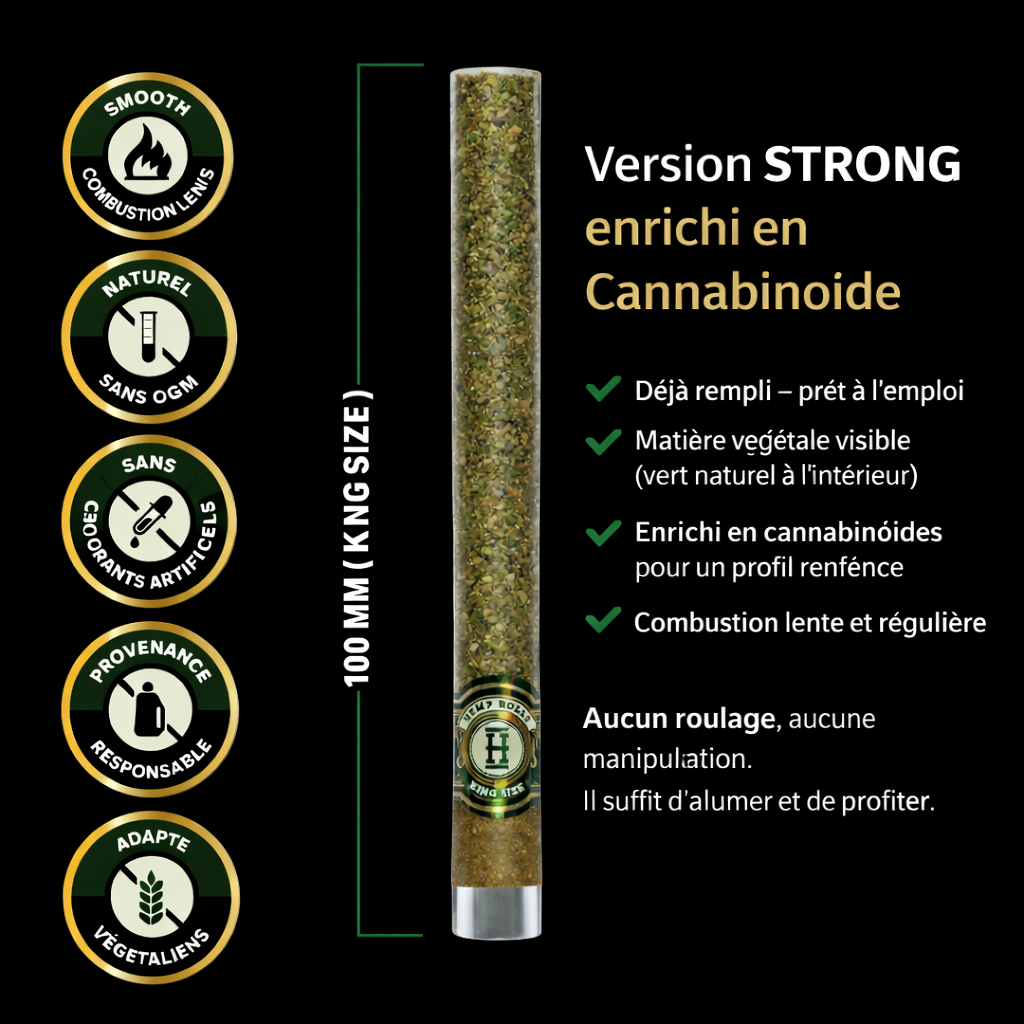 Cigarillo CBD format premium, chargé à 1,5 g, équipé d’un embout en verre (glass tip) pour une expérience plus propre, plus maîtrisée, au profil STRONG.